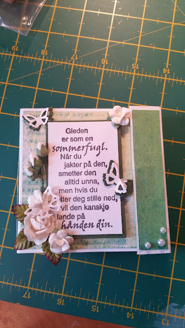 Bursdagskortene til jentene har jeg brukt ferdige bilder på, da jeg har det litt travelt med å få de ferdig. Har brukt mosegummi på teksten. Litt skjevt satt på ser jeg nå på bilde, men ser ikke så ille ut i virkeligheten. I alle fall ikke noe 13-åringene vil legge merket til håper jeg.